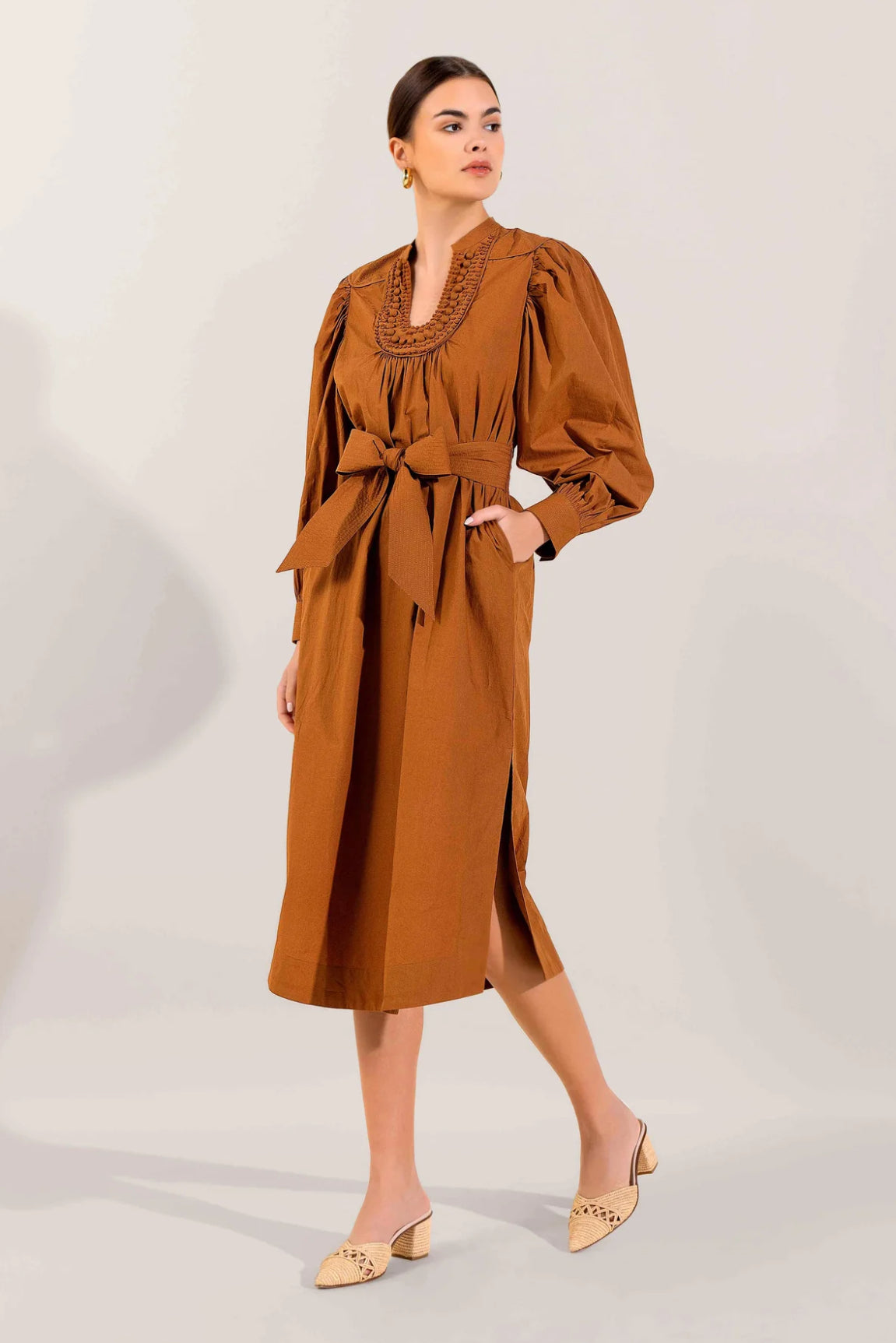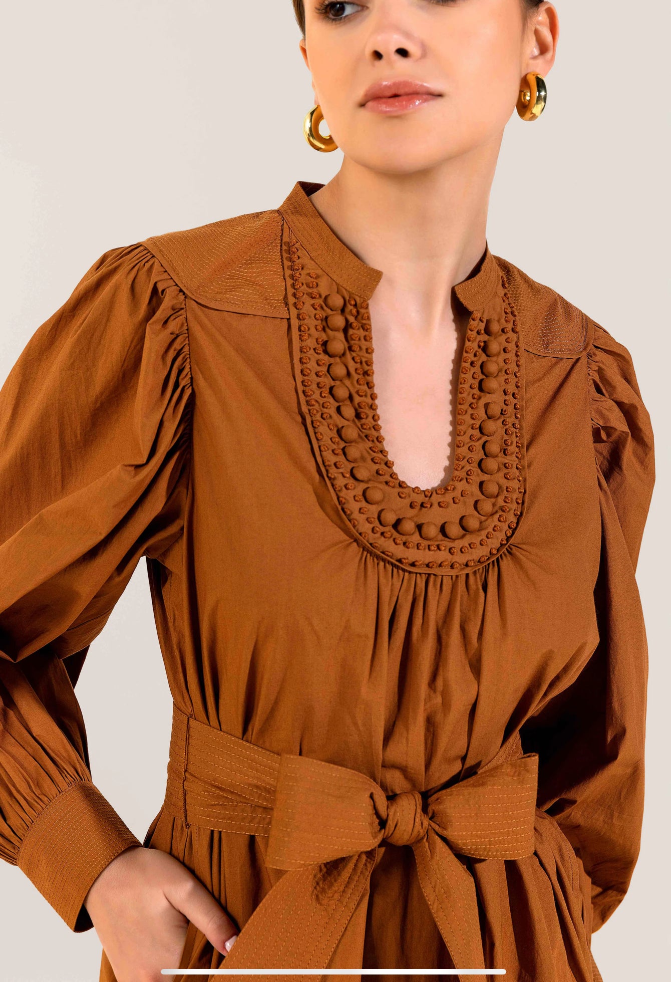 The SIENNA DRESS is a timeless staple, versatile for all seasons. Its straight midi cut and full sleeves with smocked cuffs suit any occasion. Adorned with hand-embroidered French knots and fabric-covered buttons, it exudes understated luxury. Side slits and a detachable fabric belt offer freedom and styling options for all body shapes.
