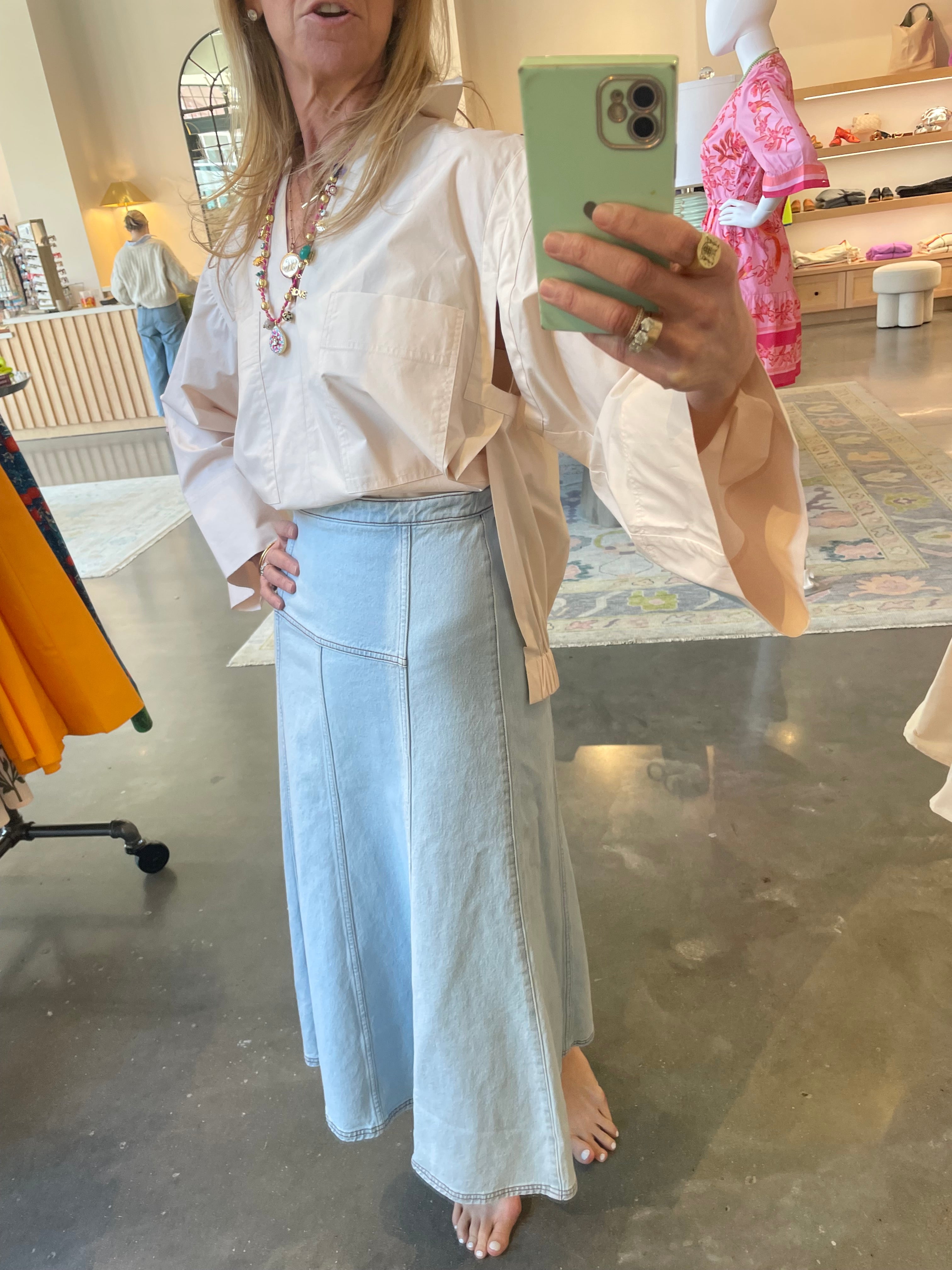 This cute ivory top can be worn tucked or untucked. A bit of a boxier fit but still gives you a good shape.