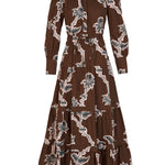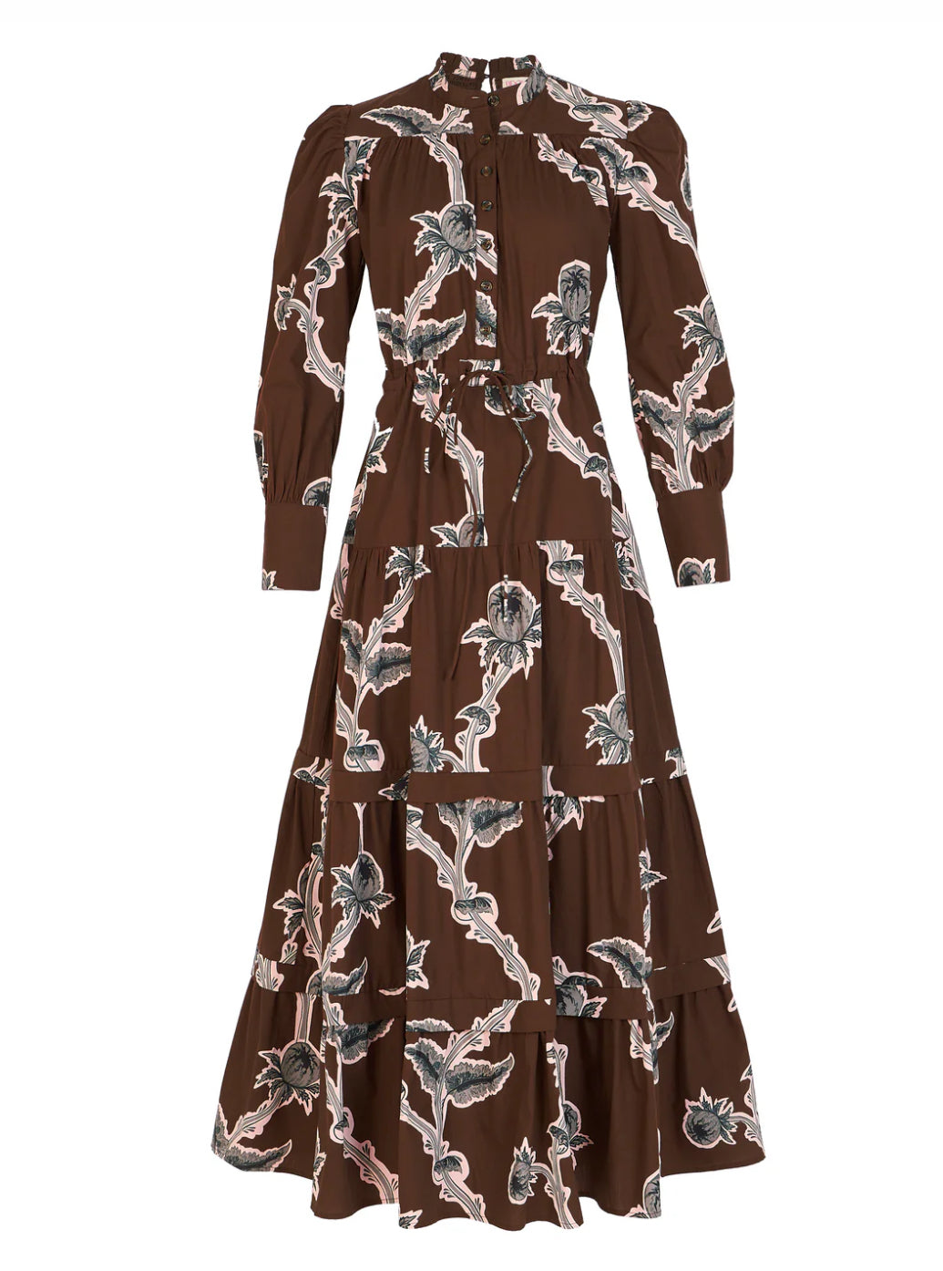 The structured sleeves, together with a romantic tiered A-line make the Sissi dress an instant icon. The self-tie cinch waist guarantees an impeccable fit. Sissi is crafted from crisp cotton poplin, breathable and soft against the skin. This print artwork is inspired by wild forest flora, capturing soft brown and vanilla tones that evoke the earthy beauty of an untouched, seasonal landscape.