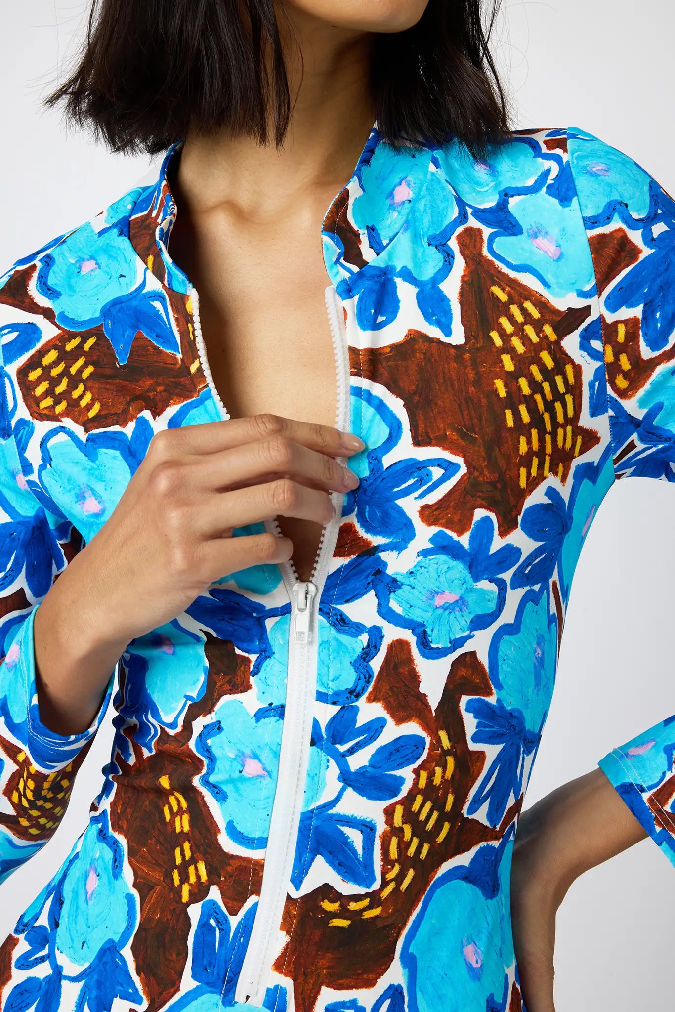 Designed for those who want maximum coverage without sacrificing style, our new long-sleeve one-piece rash guard is for you! Featuring a classic crew neck and a 3/4 length front zipper for easy wear, this suit blends sun protection with effortless elegance. Available in two fresh spring prints—Mallet Club and Sketchbook Floral.