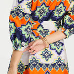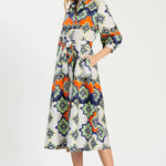 This standout midi dress is designed to make getting dressed effortless and memorable. Featuring a vibrant, artistic print layered with bold florals and geometric motifs, it brings color and personality to a timeless silhouette. The relaxed shape and flattering length make it easy to wear, while the three-quarter sleeves add polish and versatility. Style it with a sandal or heel for daytime events, then dress it up with statement jewelry for evening—this is the kind of piece that does all the work for you.