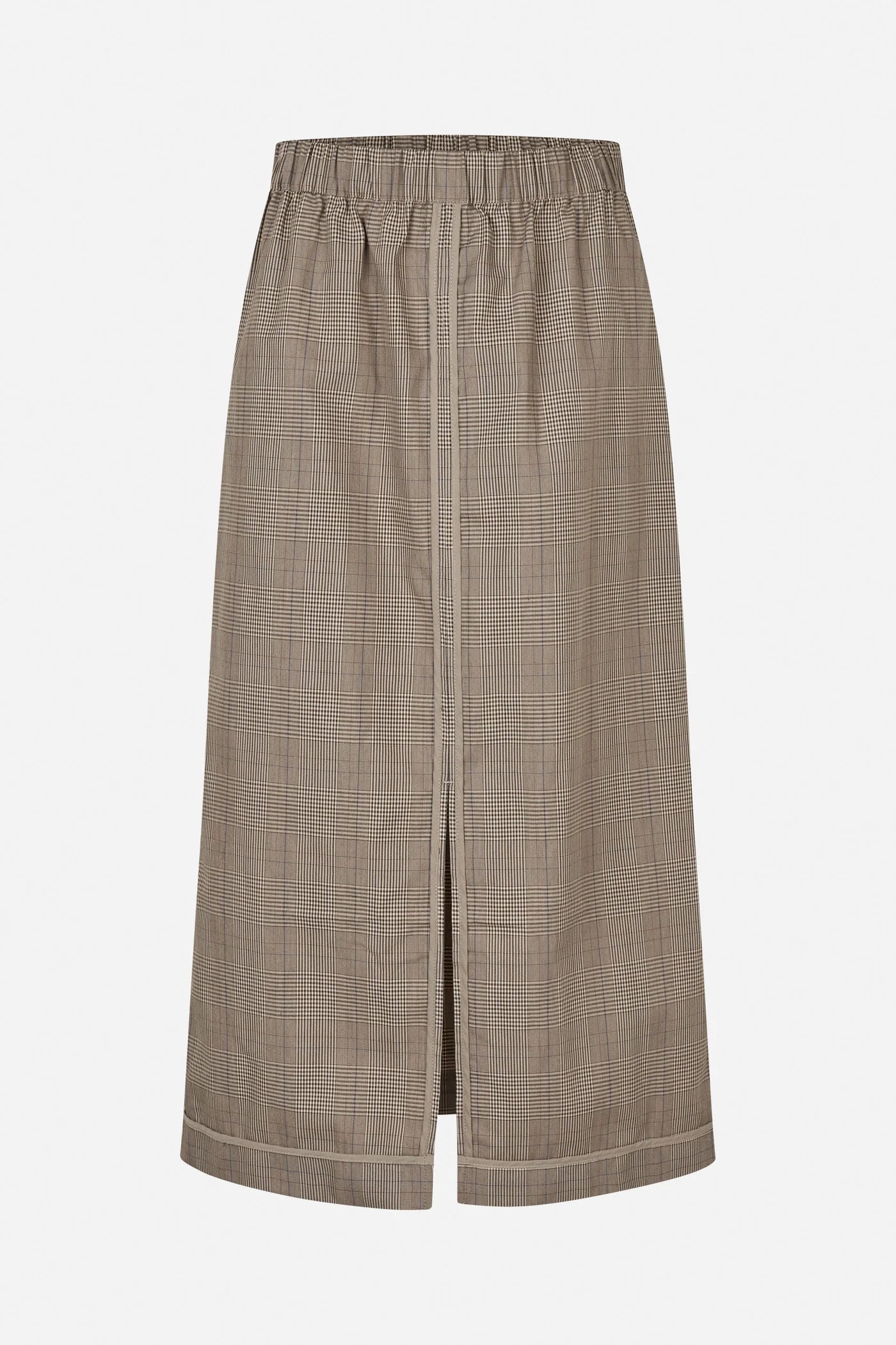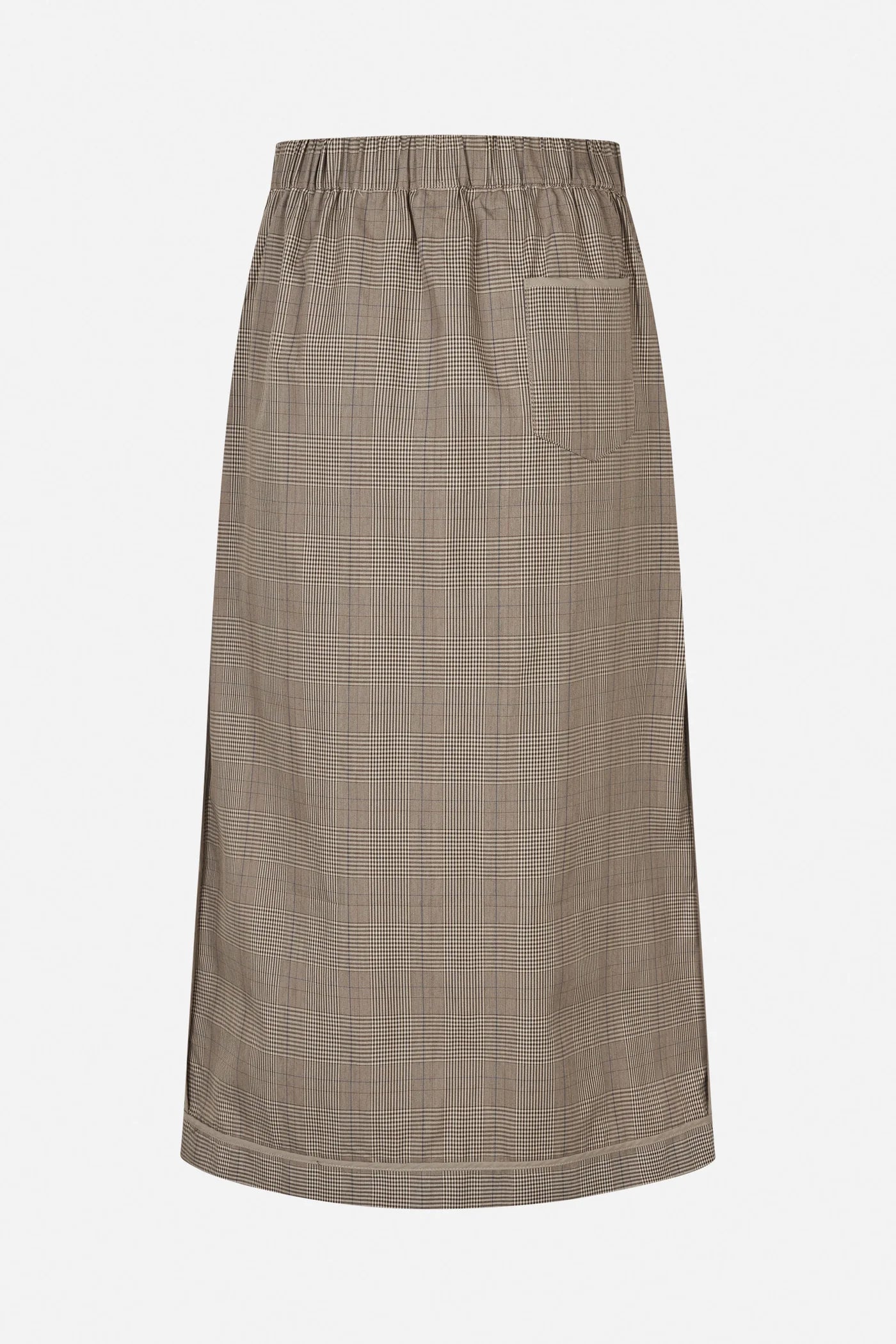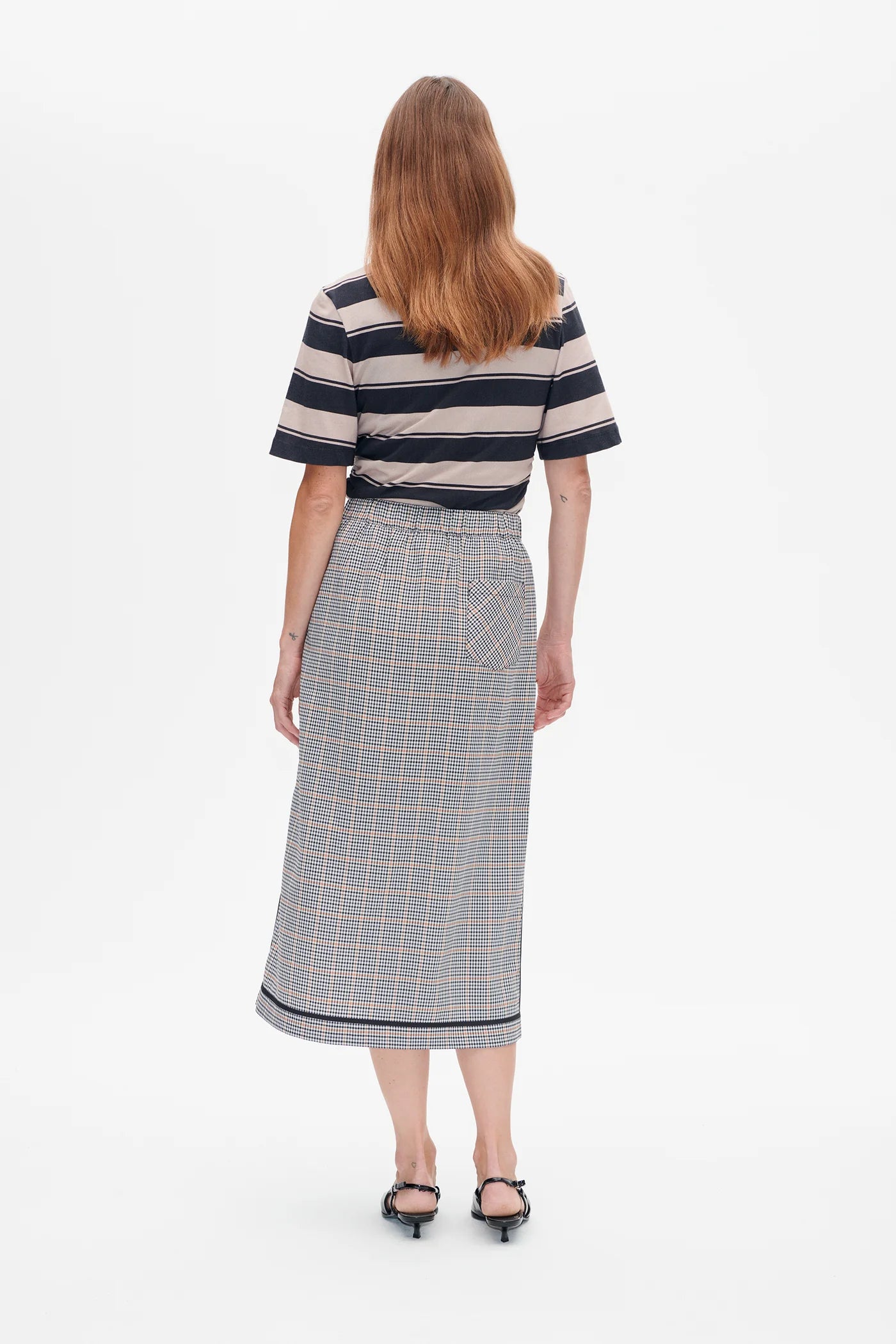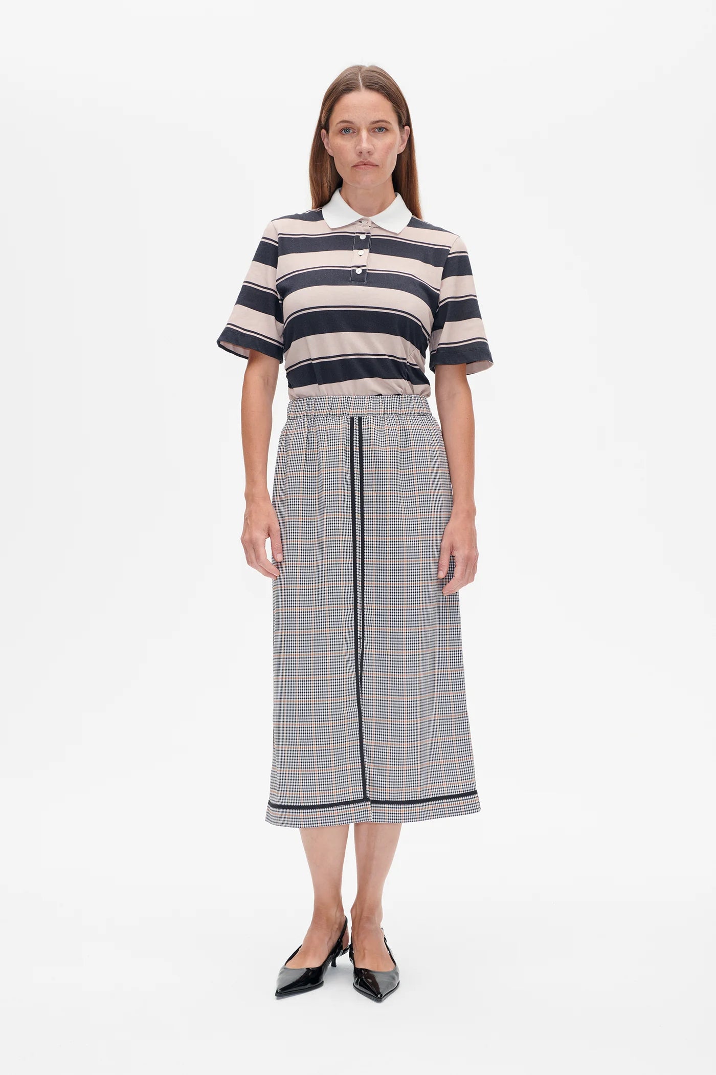 The Sofie Skirt is a midi-length, high-waist design that combines elegance with contemporary details. Featuring contrast piping for a sharp, polished look and a front slit for added movement, this skirt is both stylish and versatile. A back pocket and elasticated waistband ensure comfort and practicality, making it perfect for everyday wear or dressed-up occasions.