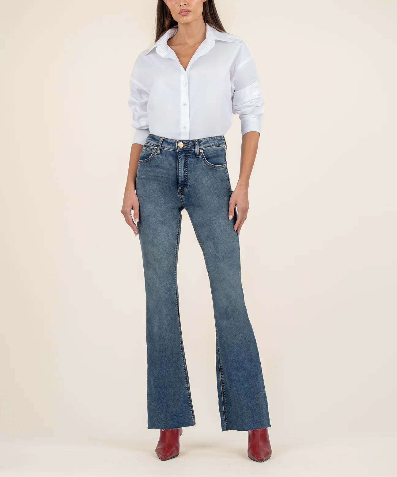 - Create an hourglass effect in these high-waist slim fit bootcut jeans, designed with raw hems in stretch denim.