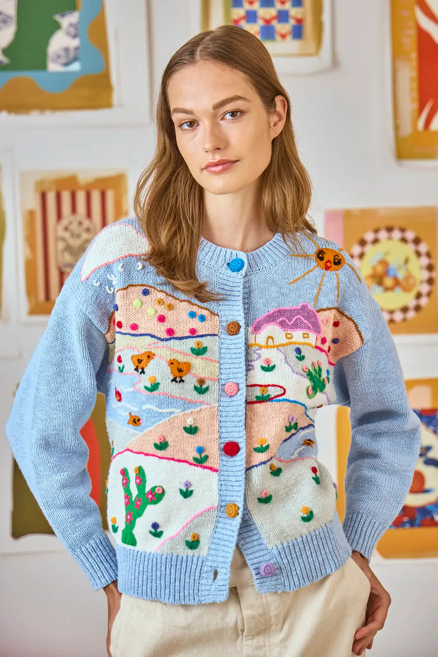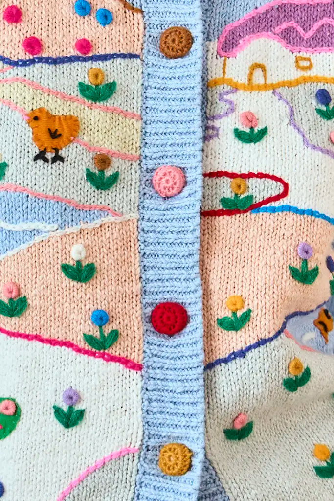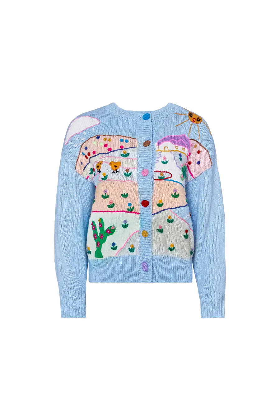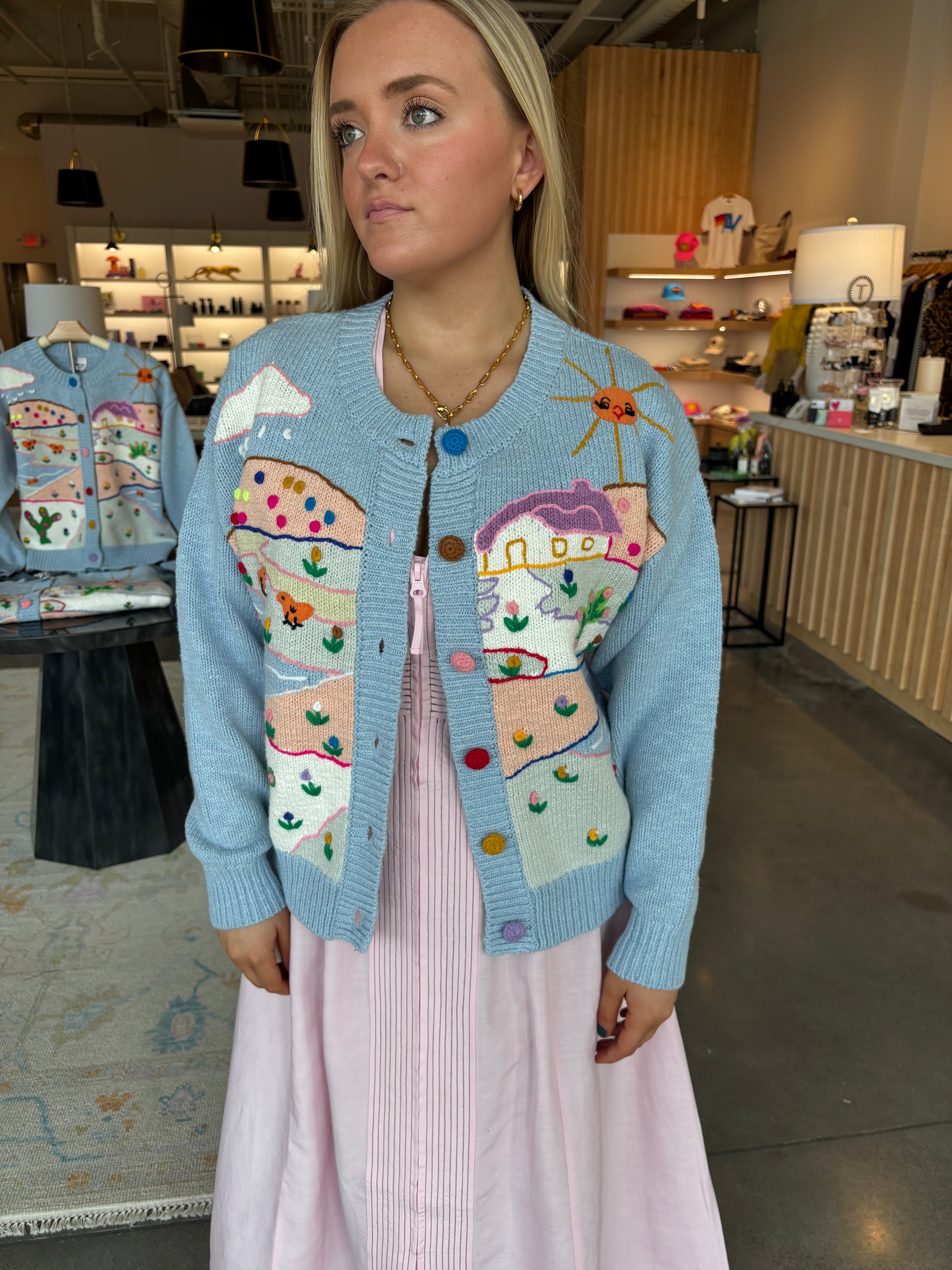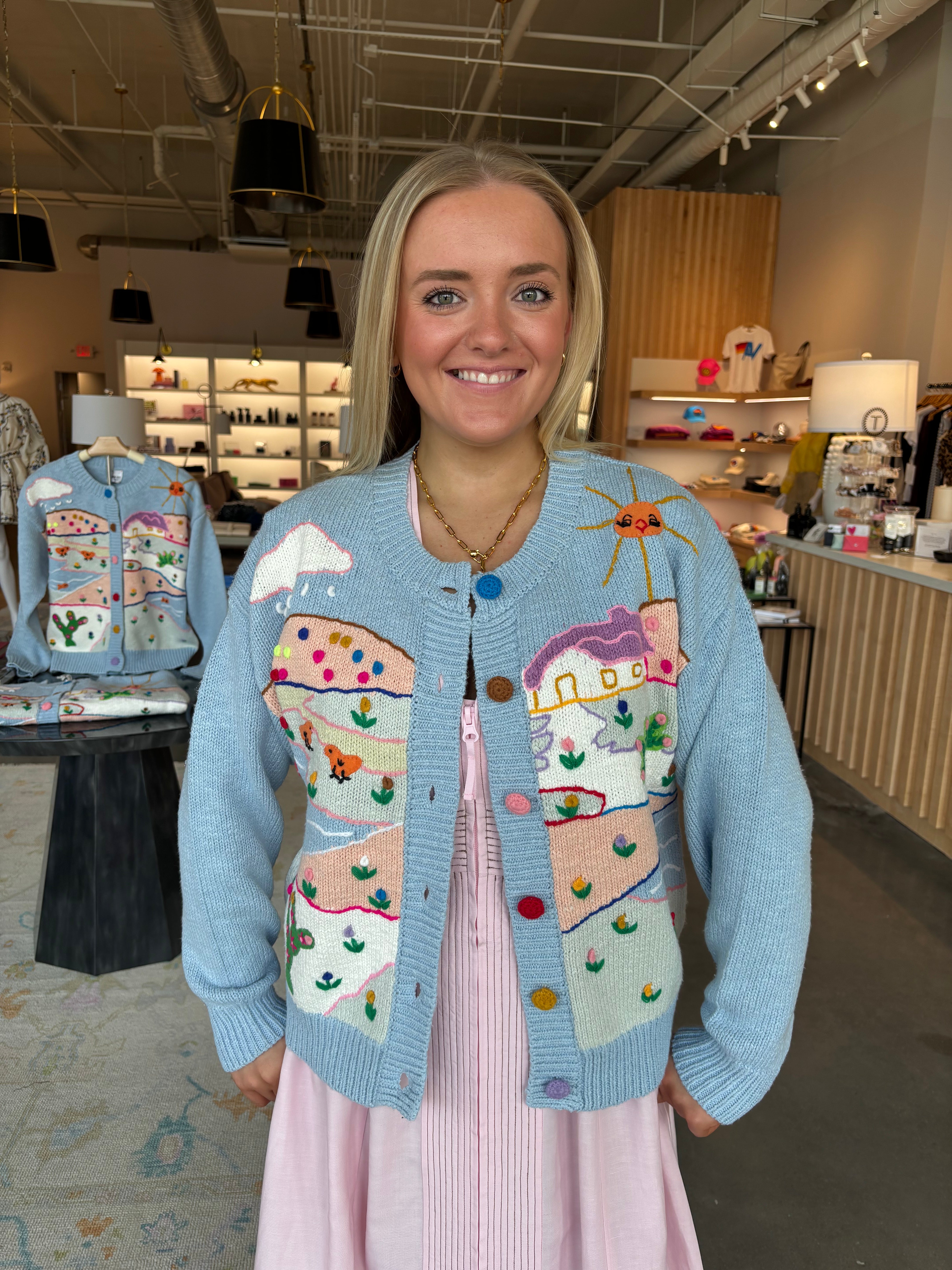 Experience a rainbow of colors with the Sunny Days Cardigan by Hunter Bell! This button-up cardigan boasts vivid buttons, an array of colors, and a playful, scenic design throughout. Long sleeves and a round neckline add the finishing touches to this charming piece.
