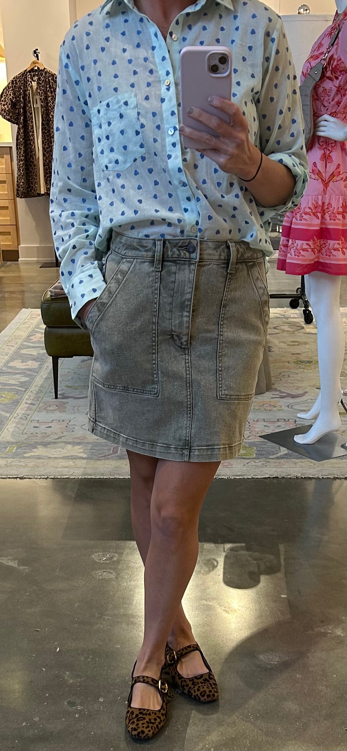 We love this sunwashed olive denim skirt. Good stretch, good length, good color!