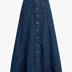 Here's our take on refined westernwear. The Lila Skirt has a high rise with an easy-at-the-hips, A-line silhouette that's 35" so it hits below the calf. It's made from a rich, dark blue lightweight rigid denim that just gets even better with each wash. Slanted front patch pockets, seam detailing and tortoiseshell buttons finish the look.
