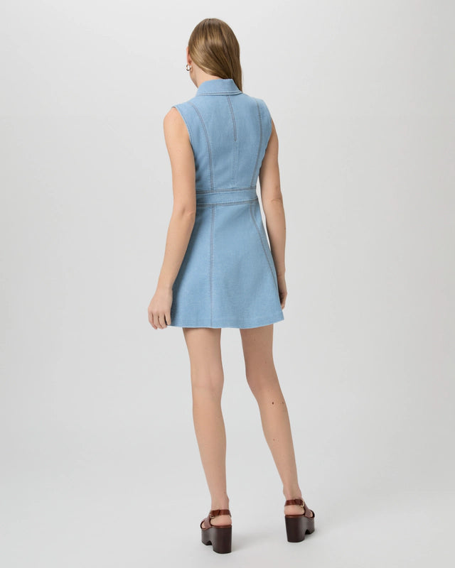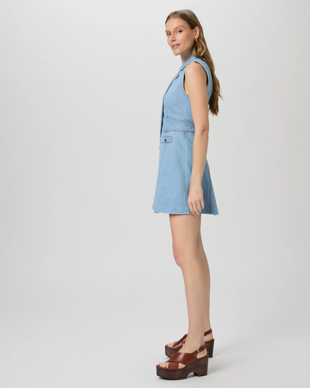 This sleeveless a-line mini dress features a v-neckline, lapel collar, welt pockets, and silver buttons. Crafted from incredibly soft denim in a vintage-inspired light wash, this flattering dress can be dressed down with sneakers or elevated with platform sandals.