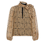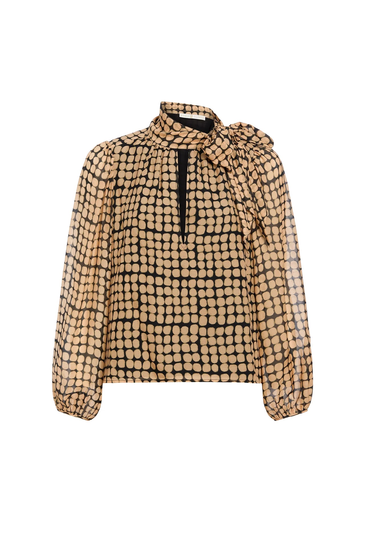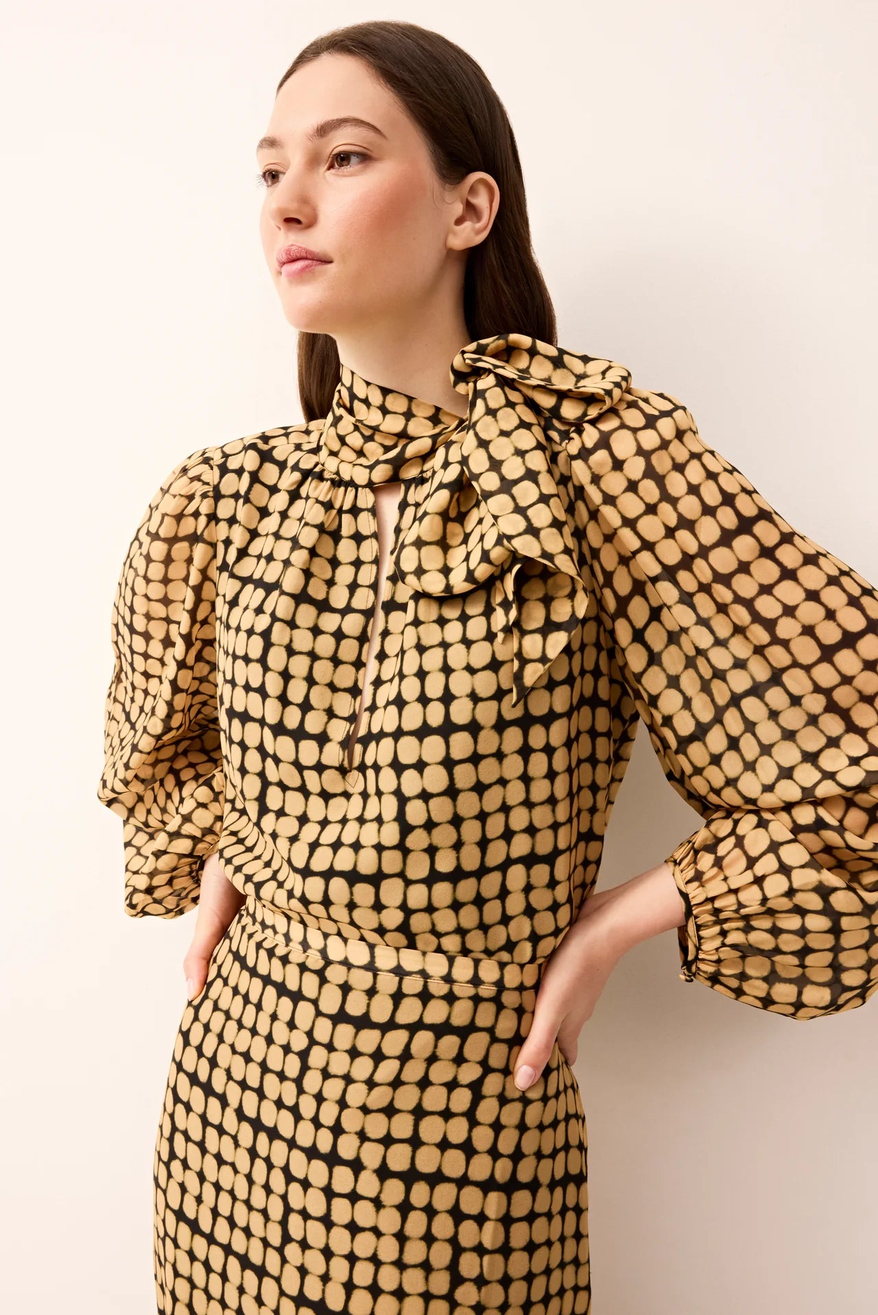 A modern take on the classic pussy-bow blouse, Vivianne stands out with a plunging keyhole neckline and the subtle metallic sheen of airy silk chiffon. Its black-and-gold dot motif evokes raindrops glistening in the evening light, or the soft glow of twinkle lights through a window on a winter night.