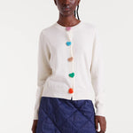 White knit cardigan with a round neck and long sleeves. A multicolored heart-shaped front closure and ribbed trim detailing. The model is 178 cm tall and is wearing a size S.
